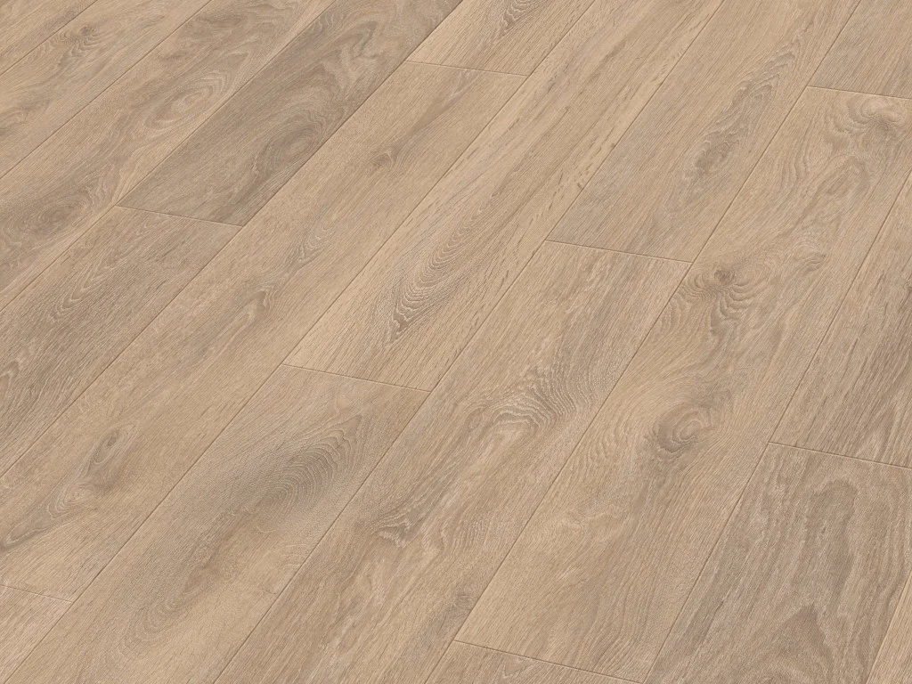 Das Dekor in edler Eichenholzoptik passt perfekt zu nahezu allen aktuellen Einrichtungsstilen. Landhausdielen besitzen mit ihrer Ein-Stab-Optik einen natürlichen und rustikalen Look, der jeden Raum gemütlich wirken lässt. Die an vier Seiten umlaufende Fase strukturiert das Verlegebild und verleiht ihm ein gleichmäßiges Muster. Dank der strukturierten Oberfläche entsteht optisch und fühlbar der Eindruck eines echten Holzbodens.
