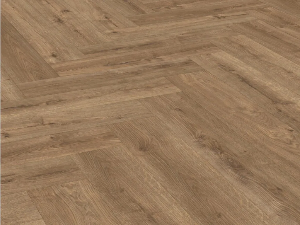 Die markante Eichenholzmaserung des Dekors vermittelt Behaglichkeit und natürliche Lebendigkeit. Das Fischgrätdesign ist nicht umsonst so populär – aufgrund seiner außergewöhnlichen, eleganten Dielenstruktur verwandelt es jeden Raum in ein luxuriöses Palais. Die authentisch wirkende Oberfläche ist durch eine feine Porenstruktur gekennzeichnet, die man so auch bei edlen Echtholzböden findet.