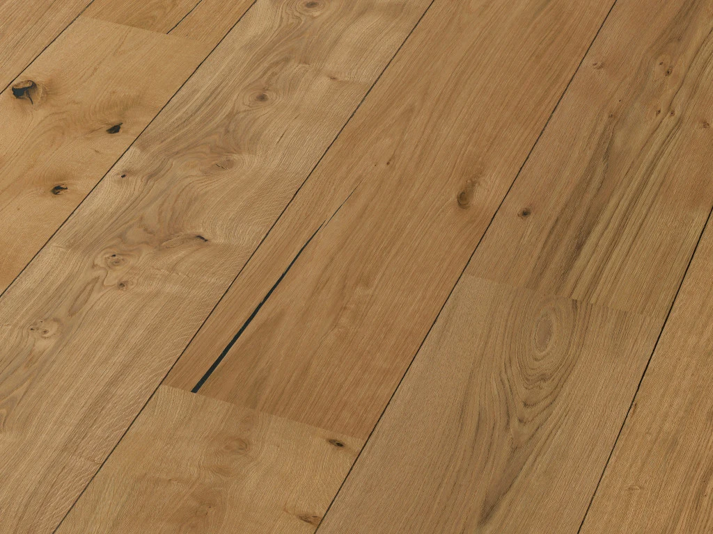 Von weicheren Holzschichten befreit, bildet das harte, stabile Kernholz der Diele eine fühlbar strukturierte, dreidimensionale und lebendig wirkende Oberfläche.