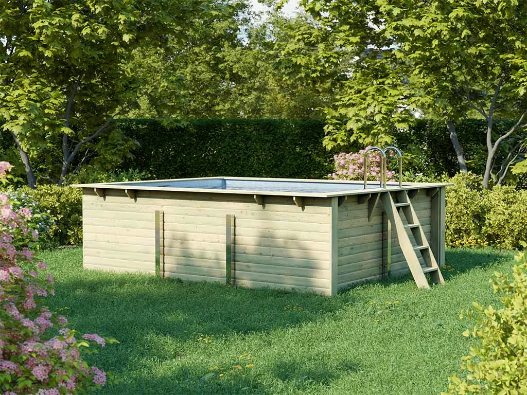 Mit dem Holzpool Modell 2 Rechteck kann Deine Urlaubsoase in kürzester Zeit nun perfektioniert werden. Der Pool besteht aus hochwertigem Massivholz und kommt in entsprechender Naturoptik. Dadurch kann er perfekt in Deine bestehende Gartenlandschaft integriert werden und lässt Dir die größtmögliche Freiheit bei der restlichen Gestaltung des Gartens. Die Oberfläche des Pools ist kesseldruckimprägniert. Somit hält das Material sowohl gutem als auch schlechtem Wetter stand, was Dir viele fröhliche Sommertage garantiert und die Langlebigkeit des Pools unterstreicht.