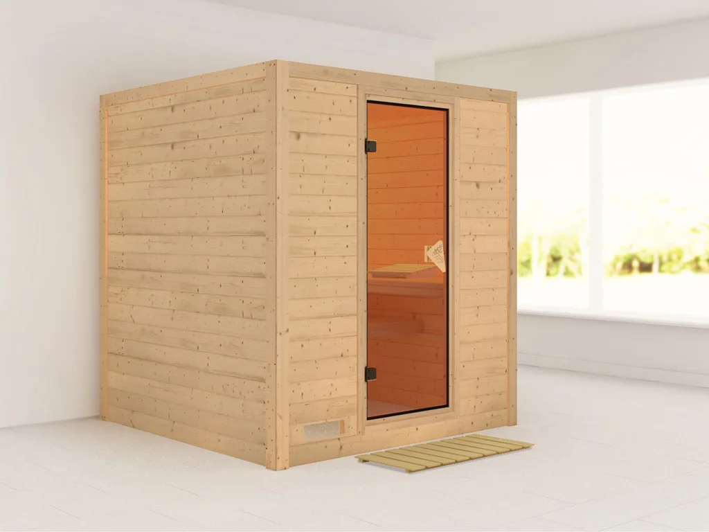 Bei der Montage einer Sauna muss ein Mindestabstand von 10 cm zu Wänden und Decke unbedingt eingehalten werden, um gute Luftzirkulation zu gewährleisten. So kann feucht-warme Luft besser abziehen. In diesem Zusammenhang müssen die Mindestraumhöhe und -breite beachtet werden.