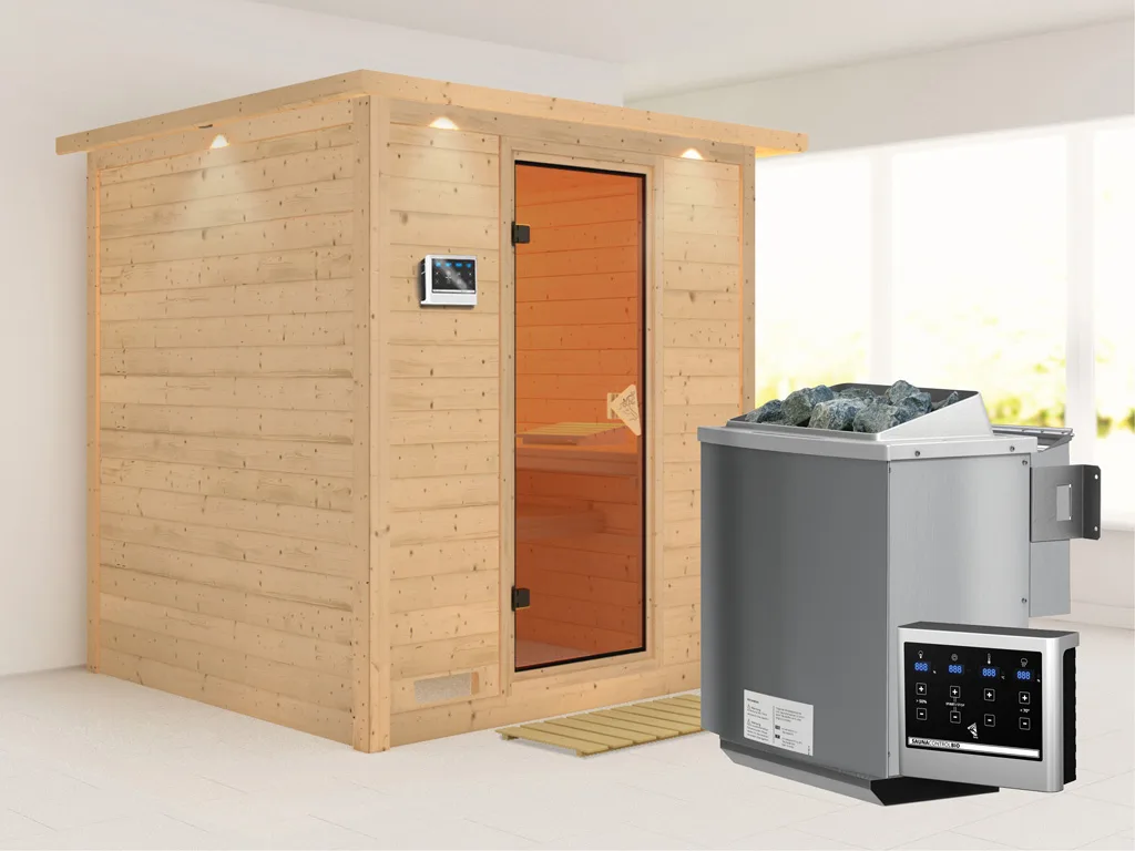 Diese Innensauna wird einschließlich Saunaofen mit externer Steuerung geliefert. Die Anbringung an der Außenseite der Sauna ermöglicht eine praktische Bedienung vor dem Saunieren und eine noch exaktere Einstellung der Temperatur. Weitere elektrische Geräte, wie eine Kabinenbeleuchtung, können ebenso an die externe Steuerung angeschlossen und mit dieser bedient werden.