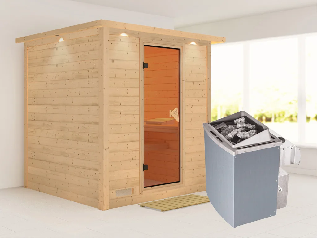 3 Liegen, Ofenschutzgitter aus stabilem Fichtenholz, 3 Liegen, 1 Kopfstütze aus Espenholz, 9 kW Ofen mit integrierter Steuerung, Dachkranz inkl. 3 LED-Strahlern á 7, 5 Watt, Bodenrost, Montageanleitung.