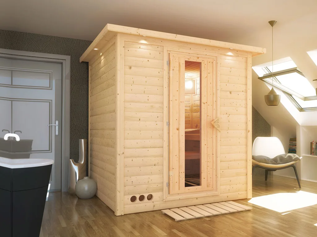 3 Liegen, Ofenschutzgitter aus stabilem Fichtenholz, Kopfstütze aus Espenholz, Dachkranz inkl. 3 LED-Strahlern á 7, 5 Watt, Bodenrost, Montageanleitung.