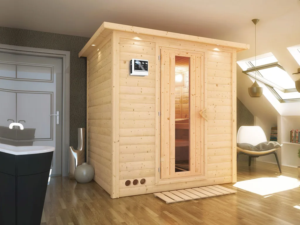 Bei dieser Innensauna ist ein Saunaofen mit einer externen Steuerung inklusive. Das Steuergerät wird außerhalb der Sauna angebracht. Auf diese Weise fängt schon vor dem Saunieren der Komfort an – mit einer bequemen Bedienung von außen und einer noch exakteren Temperatureinstellung. Weitere elektrische Geräte, wie die Kabinenbeleuchtung, können ebenso an die externe Steuerung angeschlossen und bedient werden.