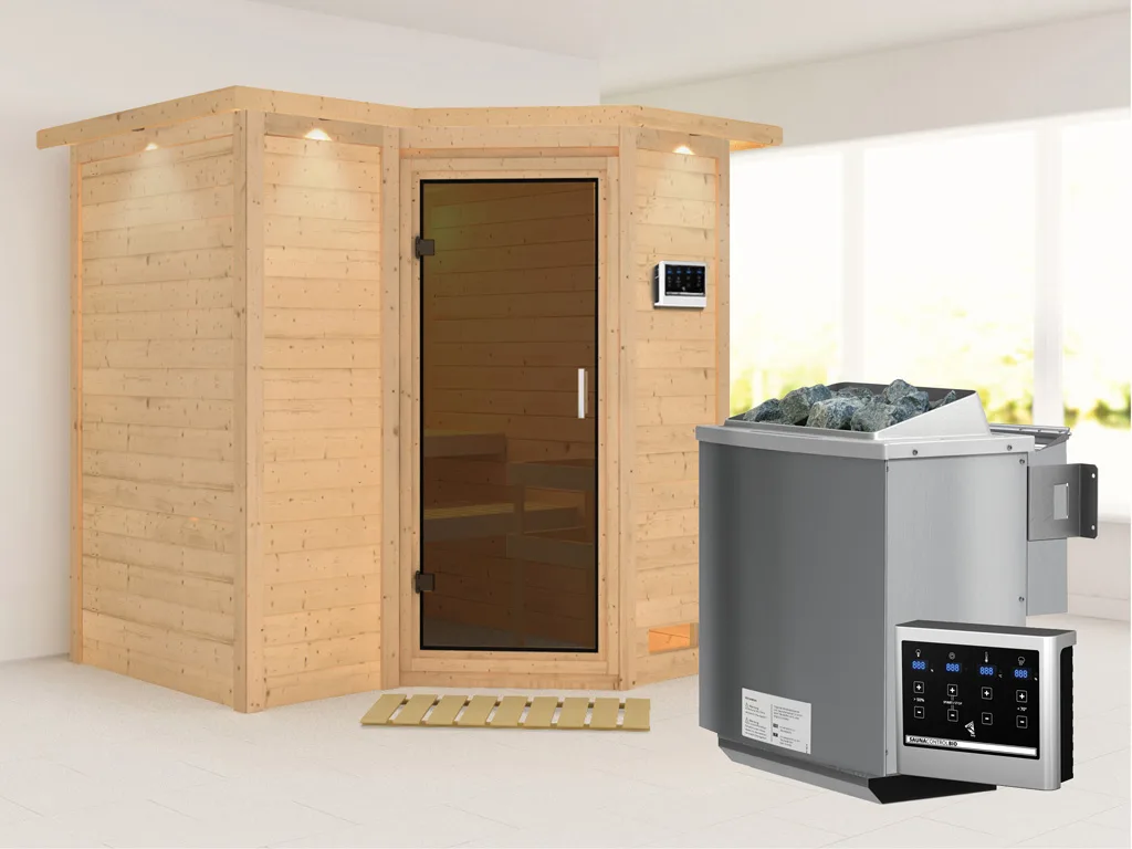 Massivholzsauna Sahib 1 mit Dachkranz, graphit Ganzglastür, inkl. 9 kW Bio-Ofen ext. Steuerung