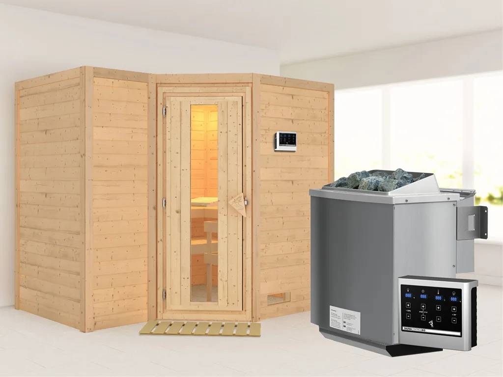 Bei dieser Innensauna ist ein Saunaofen mit einer externen Steuerung inklusive. Das Steuergerät wird außerhalb der Sauna angebracht. Auf diese Weise fängt schon vor dem Saunieren der Komfort an – mit einer bequemen Bedienung von außen und einer noch exakteren Temperatureinstellung. Weitere elektrische Geräte, wie die Kabinenbeleuchtung, können ebenso an die externe Steuerung angeschlossen und bedient werden.