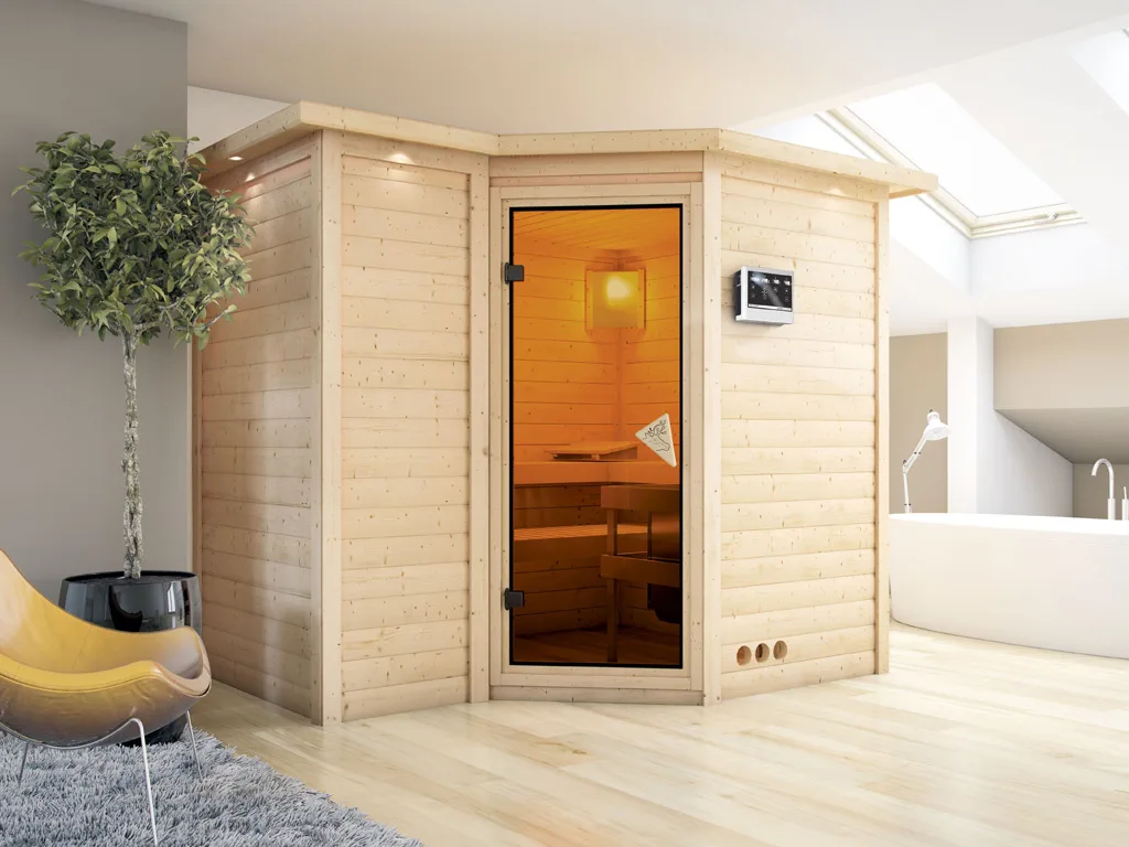Diese Innensauna wird mit Saunaofen und einer externen Steuerung geliefert. Die Anbringung des Steuergerätes erfolgt an der Außenseite der Sauna. Ganz komfortabel kann somit die Saunasteuerung von außen erledigt und die Temperatur exakt bestimmt werden. Zusätzlich verfügt das Steuergerät über eine Anschlussstelle, über die ein weiteres elektrisches Gerät bedient werden kann.