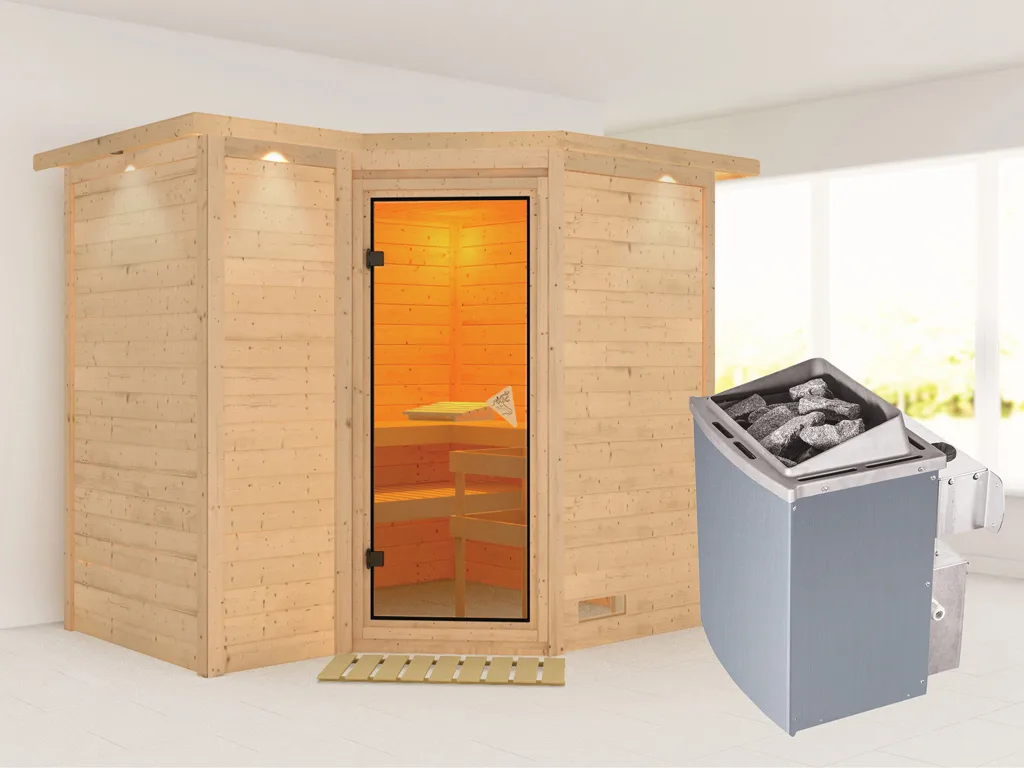 3 Liegen, Ofenschutzgitter aus stabilem Fichtenholz, 3 Liegen, 1 Kopfstütze aus Espenholz, 9 kW Ofen mit integrierter Steuerung, Dachkranz inkl. 3 LED-Strahlern á 7, 5 Watt, Bodenrost, Montageanleitung.