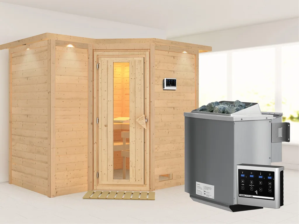 Diese Innensauna wird mit Saunaofen und einer externen Steuerung geliefert. Die Anbringung des Steuergerätes erfolgt an der Außenseite der Sauna. Ganz komfortabel kann somit die Saunasteuerung von außen erledigt und die Temperatur exakt bestimmt werden. Zusätzlich verfügt das Steuergerät über eine Anschlussstelle, über die ein weiteres elektrisches Gerät bedient werden kann.