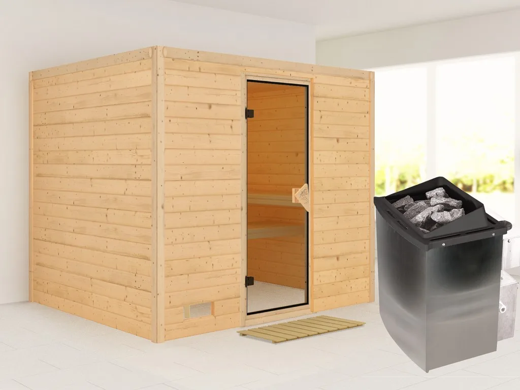 3 Liegen, Ofenschutzgitter aus stabilem Fichtenholz, 1 Kopfstütze aus Espenholz, 9 kW Ofen mit externer Steuerung, Bodenrost, Montageanleitung.