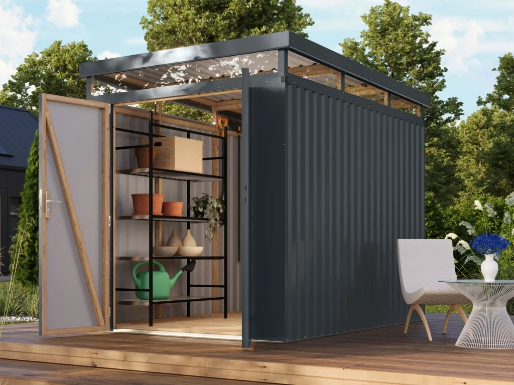 Ein modernes Pultdach verleiht deinem Gartenhaus eine stilvolle, elegante Optik. Durch nur eine geneigte Dachfläche ist die Nutzungsfläche im Inneren des Gartenhauses deutlich weniger eingeschränkt und der Verlust an Nutzraum gering. Zudem lässt die Neigungsseite des Pultdaches das Regenwasser gut abfließen und es ist die Montage von nur einer Regenrinne nötig.