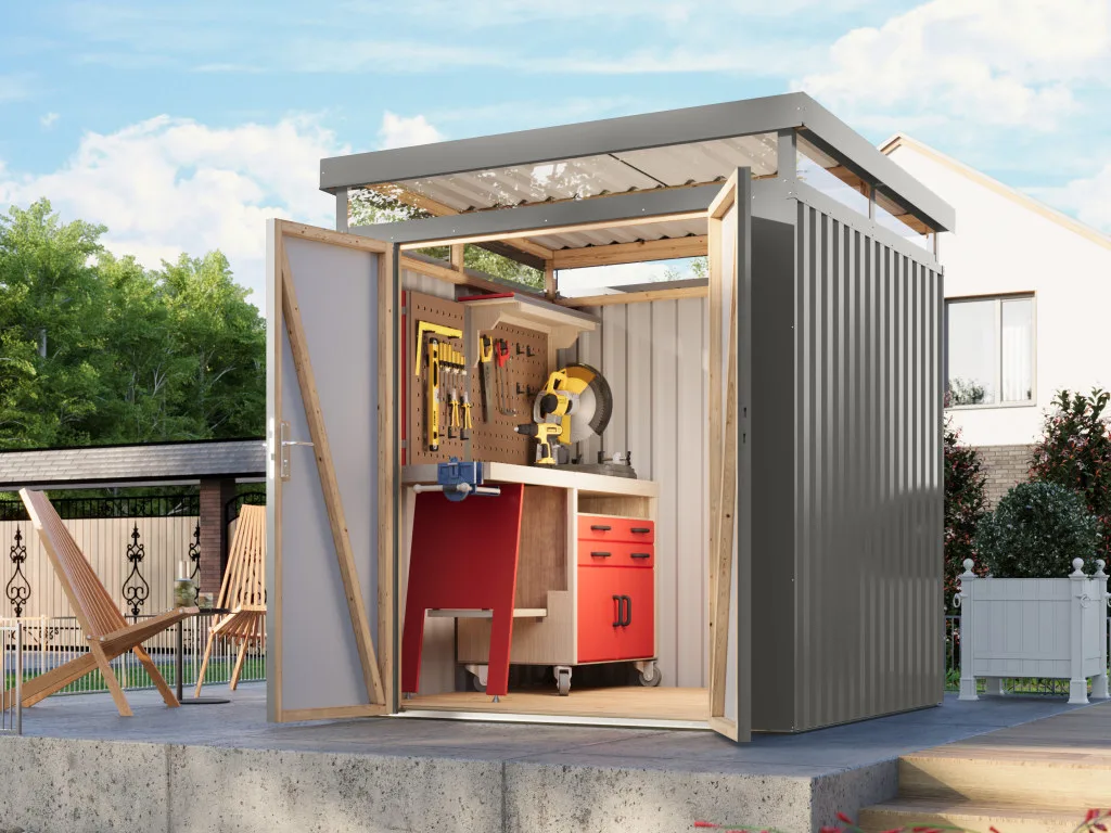 Klein, aber fein – dieses Gerätehaus bietet ausreichend Stauraum, ohne dabei viel Platz im Garten einzunehmen. So kannst du deine Geräte ganz leicht witterungsgeschützt und diebstahlsicher verstauen. Das Häuschen besteht aus verzinktem Metall und ist dadurch besonders langlebig und robust.