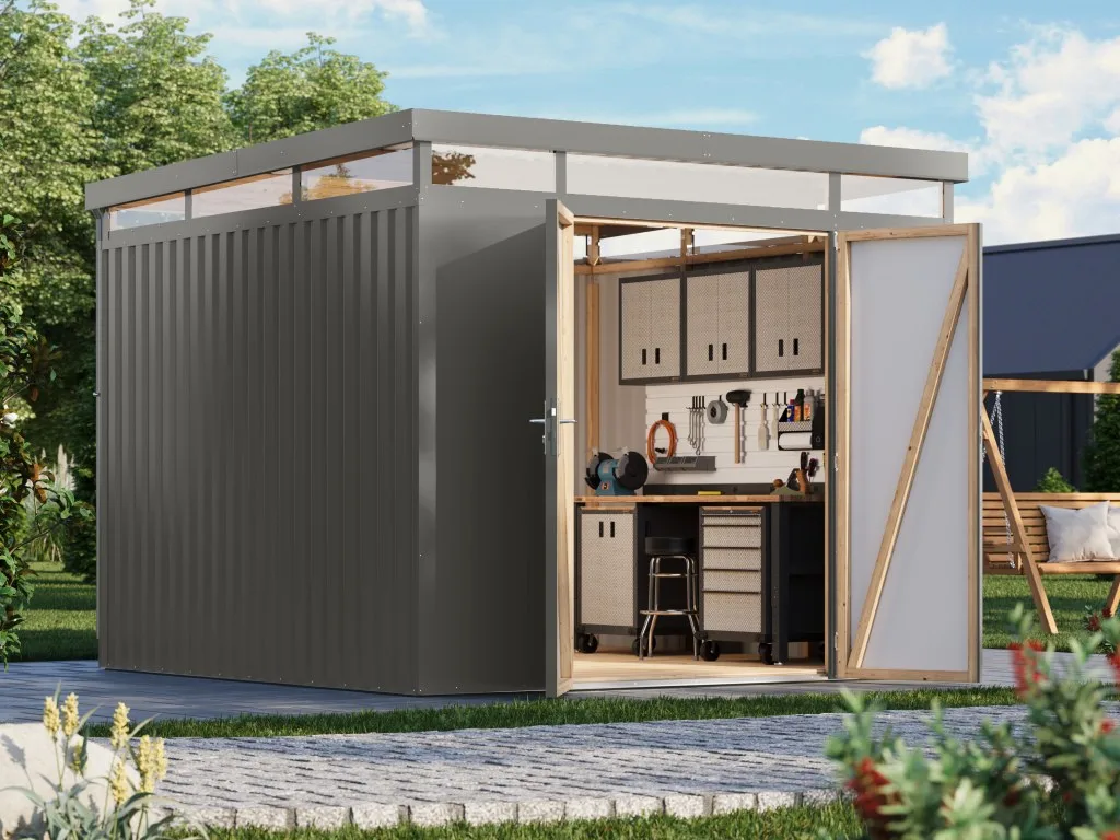 Ein modernes Pultdach verleiht deinem Gartenhaus eine stilvolle, elegante Optik. Durch nur eine geneigte Dachfläche ist die Nutzungsfläche im Inneren des Gartenhauses deutlich weniger eingeschränkt und der Verlust an Nutzraum gering. Zudem lässt die Neigungsseite des Pultdaches das Regenwasser gut abfließen und es ist die Montage von nur einer Regenrinne nötig.