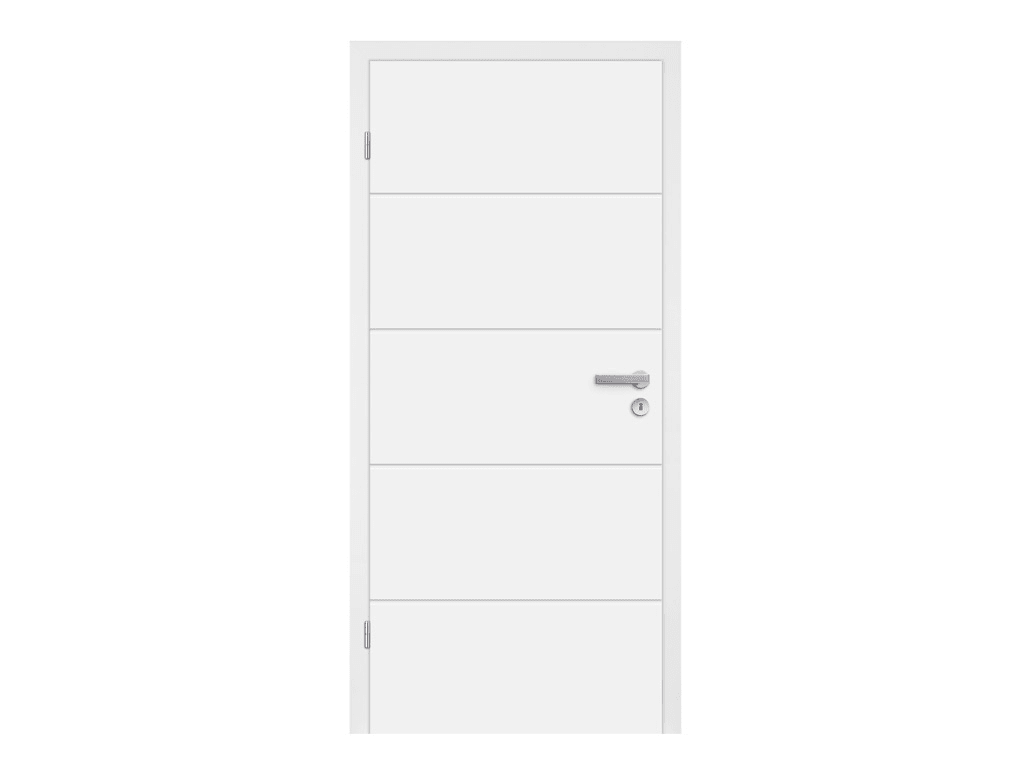 Moderne Eingangstür mit V-förmigen Einfräsungen und Weißlack.