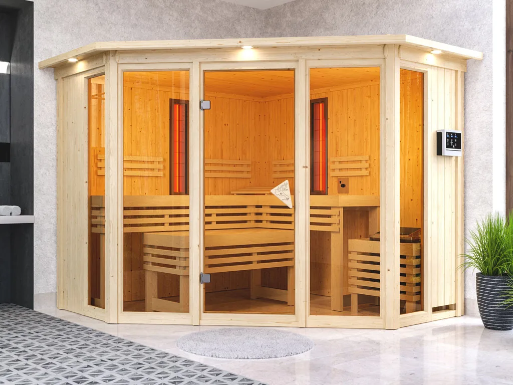 Bei dieser Innensauna ist ein Saunaofen mit einer externen Steuerung inklusive. Das Steuergerät wird außerhalb der Sauna angebracht. Auf diese Weise fängt schon vor dem Saunieren der Komfort an – mit einer bequemen Bedienung von außen und einer noch exakteren Temperatureinstellung. Weitere elektrische Geräte, wie die Kabinenbeleuchtung, können ebenso an die externe Steuerung angeschlossen und bedient werden.