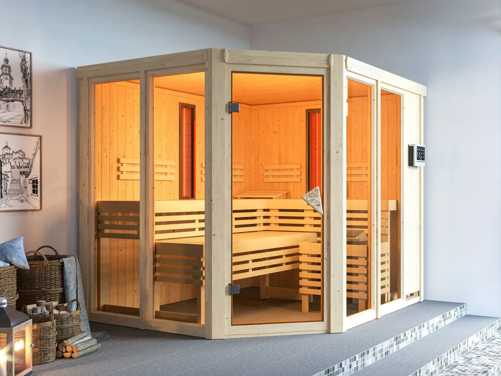 9 kW Bio-Kombiofen, ext. Steuerung, 3 Liegen, 2 x 500 Watt (1000W) Strahler, Kopfstütze, Ofenschutzgitter, Rückenlehne, Bankblende, Montageanleitung.