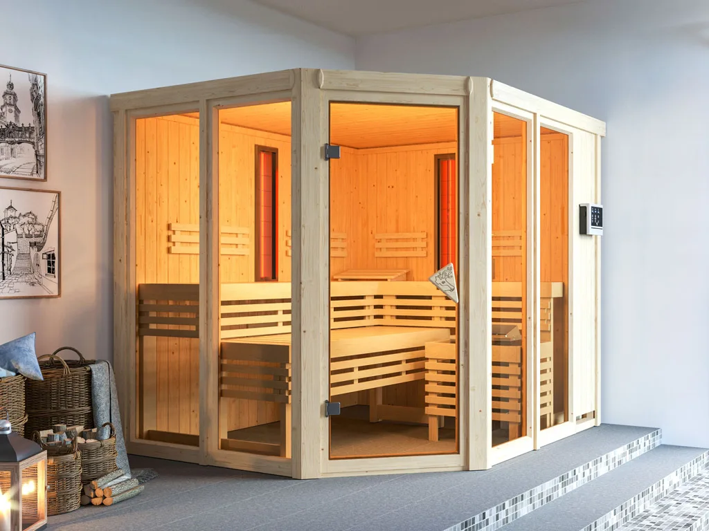 Bei dieser Innensauna ist ein Saunaofen mit einer externen Steuerung inklusive. Das Steuergerät wird außerhalb der Sauna angebracht. Auf diese Weise fängt schon vor dem Saunieren der Komfort an – mit einer bequemen Bedienung von außen und einer noch exakteren Temperatureinstellung. Weitere elektrische Geräte, wie die Kabinenbeleuchtung, können ebenso an die externe Steuerung angeschlossen und bedient werden.