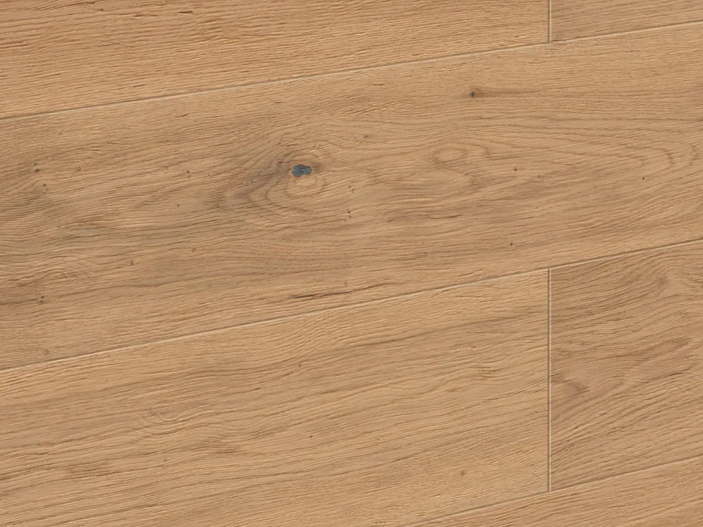 Die an vier Seiten umlaufende Microfuge erzeugt ein dezentes Fugenbild und vermittelt dadurch den Eindruck einer einheitlichen Fläche ohne Unterbrechungen. Durch die Oberflächenveredelung mit Ultramattlackierung in Hellbraun sind die Paneele besonders pflegeleicht und weitgehend unempfindlich gegen übliche Flecken.