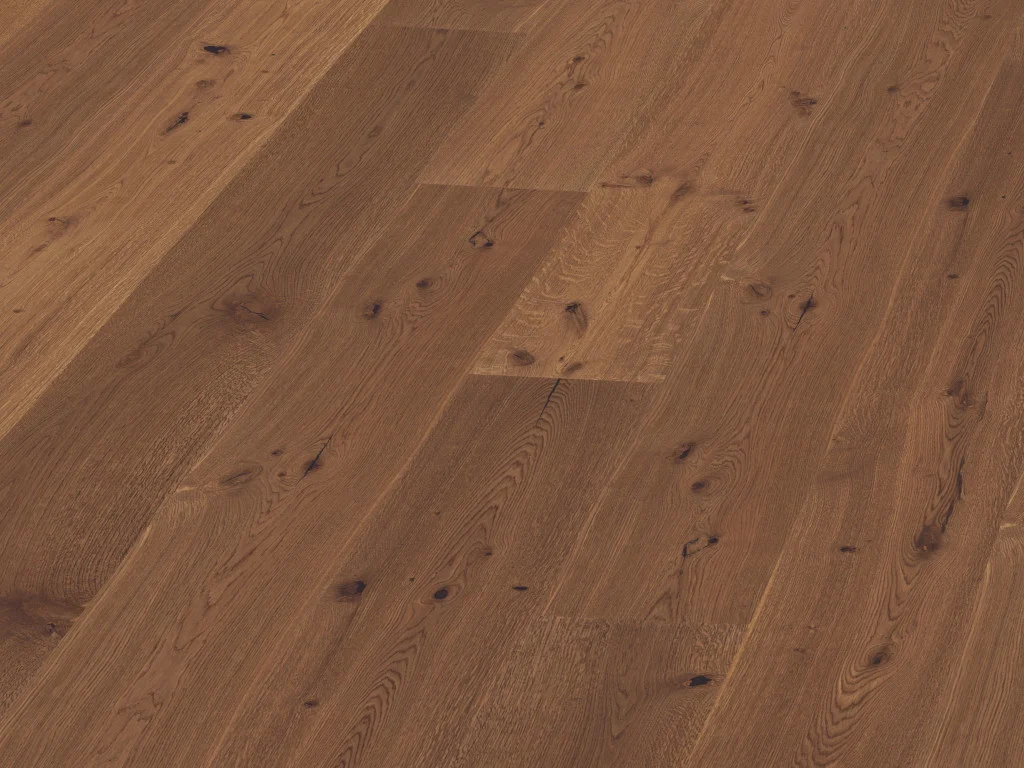 Von weicheren Holzschichten befreit, bildet das harte, stabile Kernholz der Diele eine fühlbar strukturierte, dreidimensionale und lebendig wirkende Oberfläche. Die Oberflächenbehandlung mit reinem natürlichem Öl bietet Pflege und Schutz in einem.