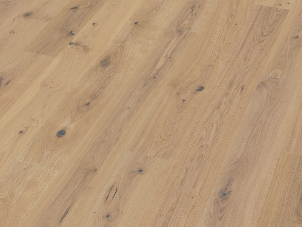 Das Parkett ist "classic" gemasert: Es treten wenige kleine schwarze Astlöcher auf. Selten finden sich auch feine Risse im Holz.