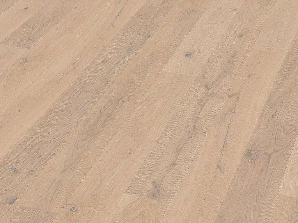 Von weicheren Holzschichten befreit, bildet das harte, stabile Kernholz der Diele eine fühlbar strukturierte, dreidimensionale und lebendig wirkende Oberfläche. Dank der atmungsaktiven weiß-geölten Oberfläche erhält das Holz den nötigen pflegeleichten Schutz und passt ideal zu Möbeln im Shabby-Chic-Style.