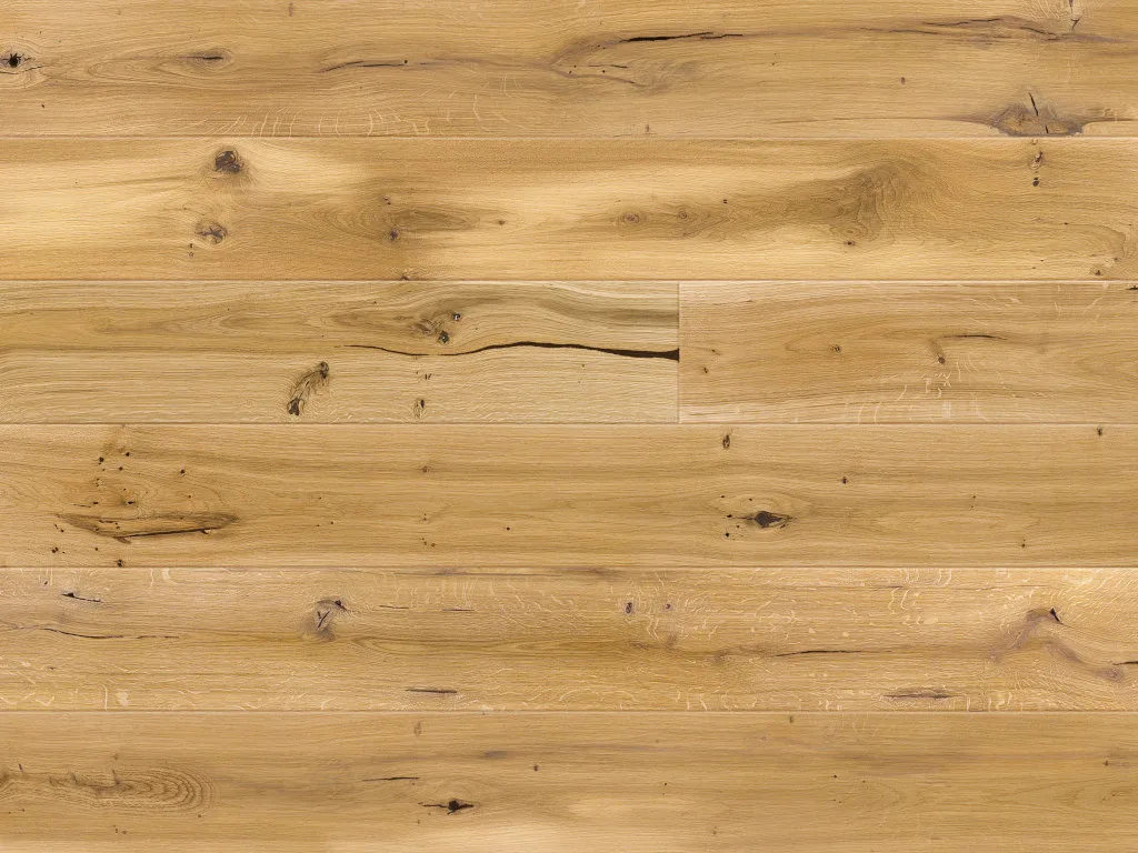 Das Parkett ist wild gemasert: Es finden sich sehr viele Astlöcher und viele große Risse im Holz.