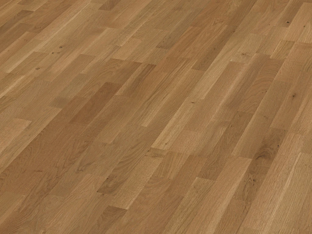 Die oberste Schicht des Parketts bildet die pflegleichte und 2,5 mm starke Eiche -Nutzschicht.