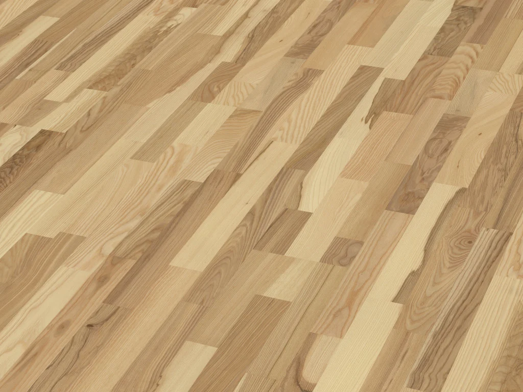 Dieser Boden aus Eschenholz besitzt eine schöne Sortierung mit leicht marmorierter bis wolkig anmutender Maserung. Die Esche liefert ein schweres und hartes Holz mit ausgezeichneten Festigkeitseigenschaften und ist besonders widerstandsfähig und pflegeleicht.