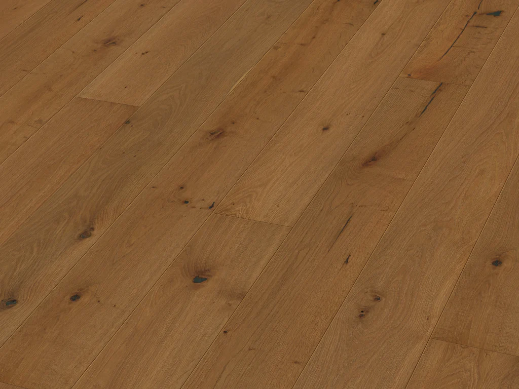 Typisch für das verwendete Eichenholz dieser Diele sind die Jahresringe sowie kleinere oder größere Astfüllungen, die für einen einzigartigen, individuellen Look in Deinem Heim sorgen. Aufgrund seiner Härte und schönen Maserung ist der Eichenholzboden der ultimative Lieblingsboden der Europäer.