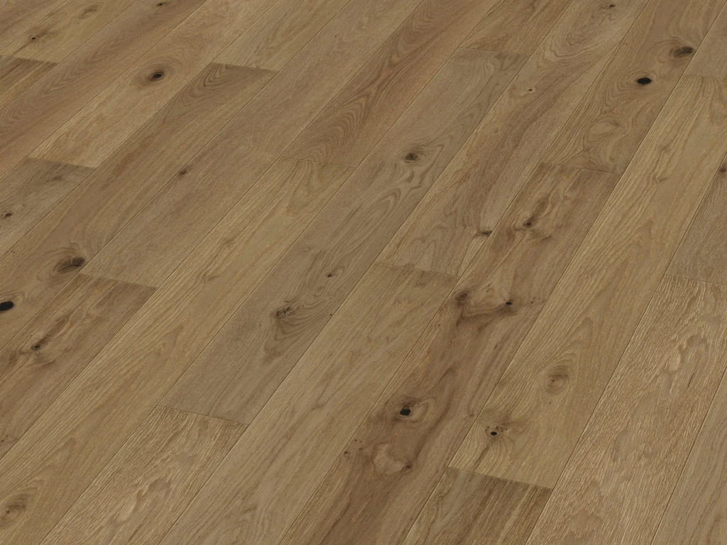 Das Holz der Eiche verleiht diesen Dielen einen urwüchsigen Charakter und schenkt allen Räumen stilvolle Wärme und Behaglichkeit. Neben seiner luxuriösen Optik ist Eichenholz relativ hart, aber dennoch trittelastisch.