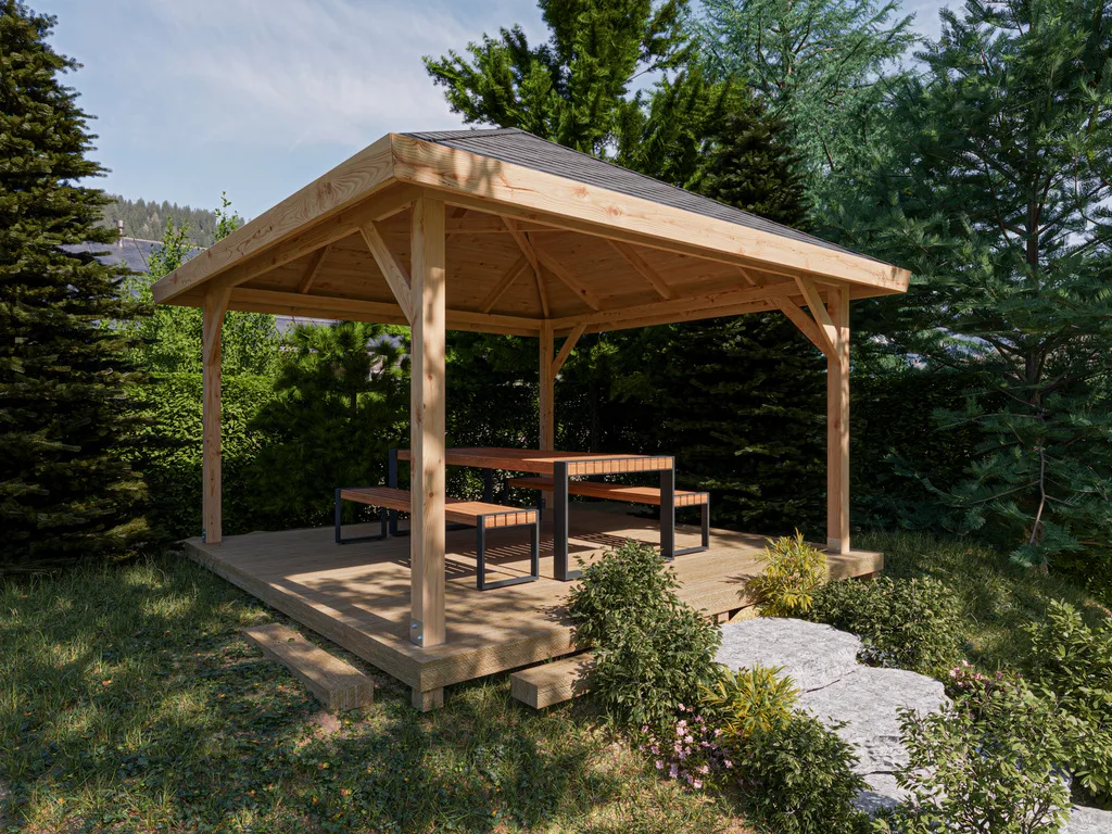 Das naturbelassene Holz sorgt für ein natürliches und zeitloses Aussehen. Bitte beachte, dass der Pavillon spätestens direkt nach der Montage mit einem Holzschutzmittel zu bearbeiten ist. Bei der Auswahl von Holzschutzmitteln empfehlen wir, dich im Fachhandel beraten zu lassen oder der Empfehlung des Herstellers zu folgen, die du in der beiliegenden Montageanleitung findest. Nach dem Erstanstrich sollte die Behandlung mindestens alle zwei Jahre wiederholt werden, um das Holz dauerhaft vor Verformung, Verwitterung und Schädlingsbefall zu schützen. Eine sich mit der Zeit entwickelnde, silbergraue Patina ist eine natürliche Eigenschaft des Holzes und stellt keinen Mangel dar.