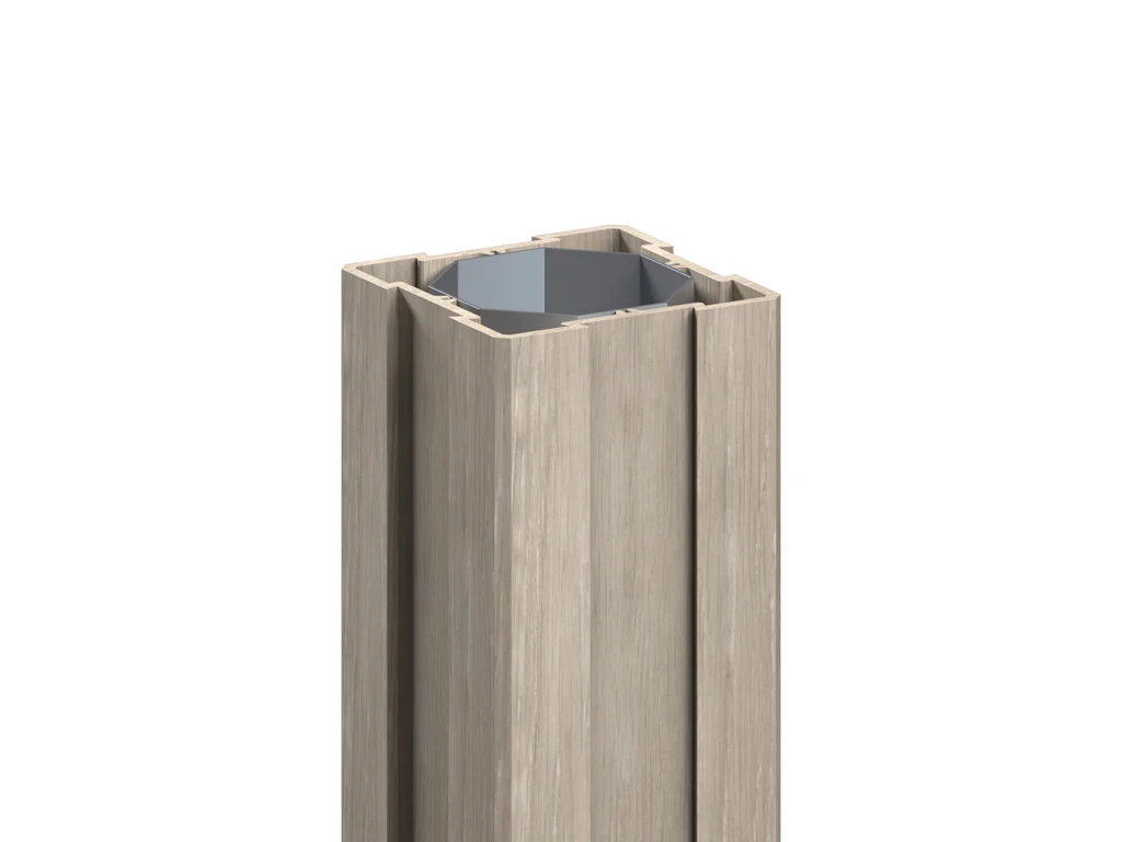 Der Pfosten ist aus Kunststoff und der Hohlraum ist mit einer 8-eckigen Metallwelle verstärkt und verdeckt die Bodenbefestigung. Der Kunststoff wird mit einer stabilen Folie beschichtet, die unter Druck aufgebracht wird.