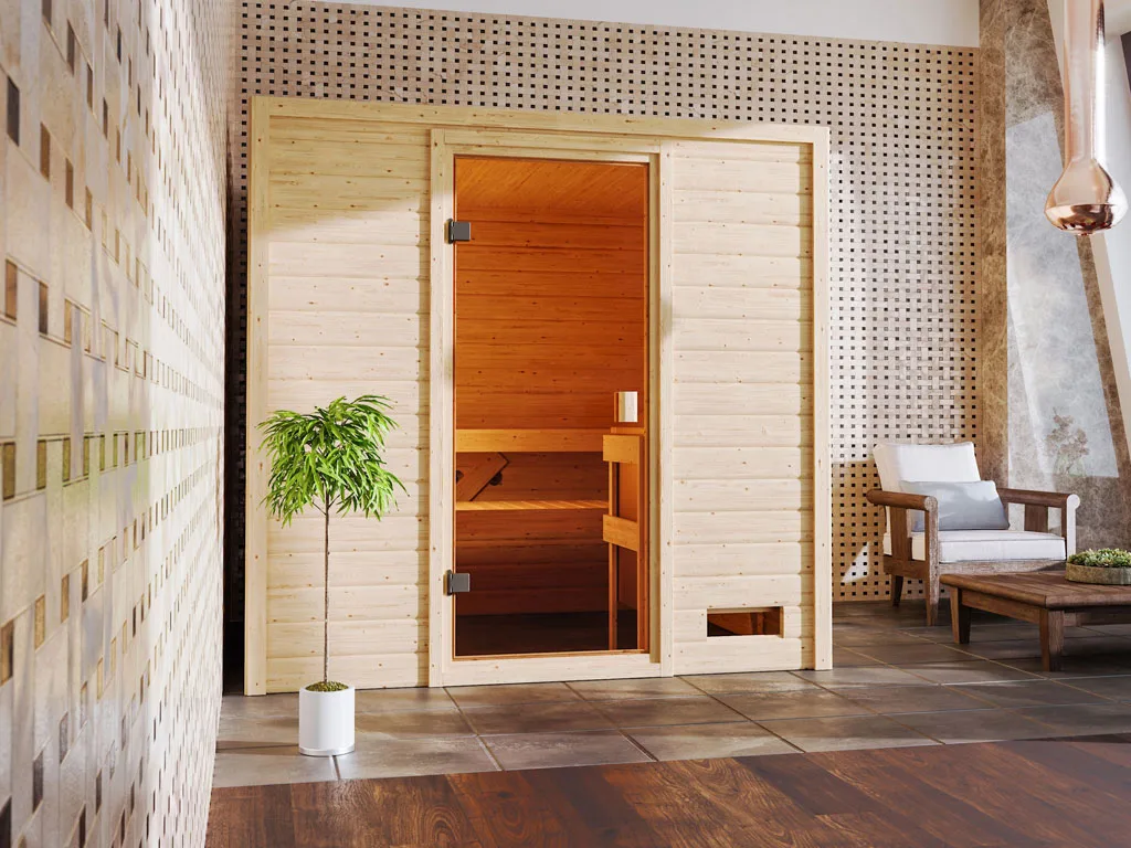 Bei der Montage einer Sauna muss ein Mindestabstand von 10 cm zu Wänden und Decke unbedingt eingehalten werden, um gute Luftzirkulation zu gewährleisten. So kann feucht-warme Luft besser abziehen. In diesem Zusammenhang müssen die Mindestraumhöhe und -breite beachtet werden.