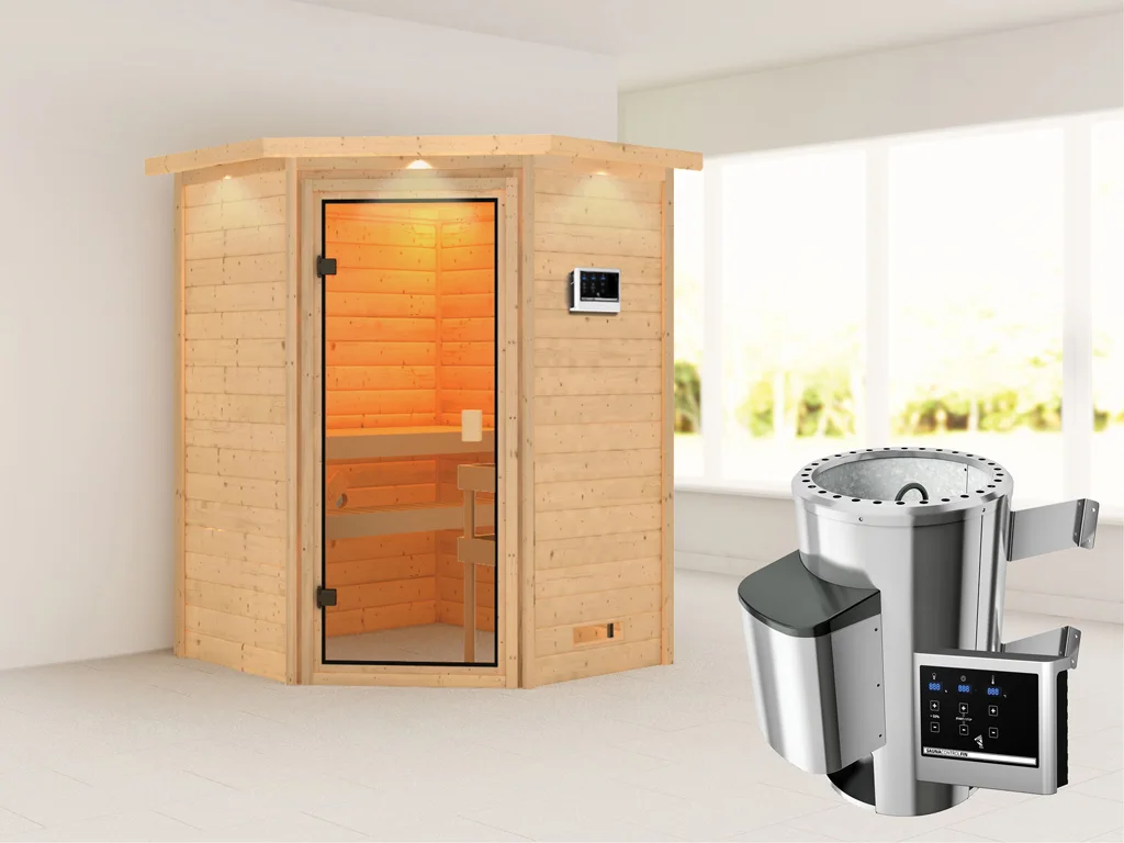 Diese Innensauna wird mit Saunaofen und einer externen Steuerung geliefert. Die Anbringung des Steuergerätes erfolgt an der Außenseite der Sauna. Ganz komfortabel kann somit die Saunasteuerung von außen erledigt und die Temperatur exakt bestimmt werden. Zusätzlich verfügt das Steuergerät über eine Anschlussstelle, über die ein weiteres elektrisches Gerät bedient werden kann.