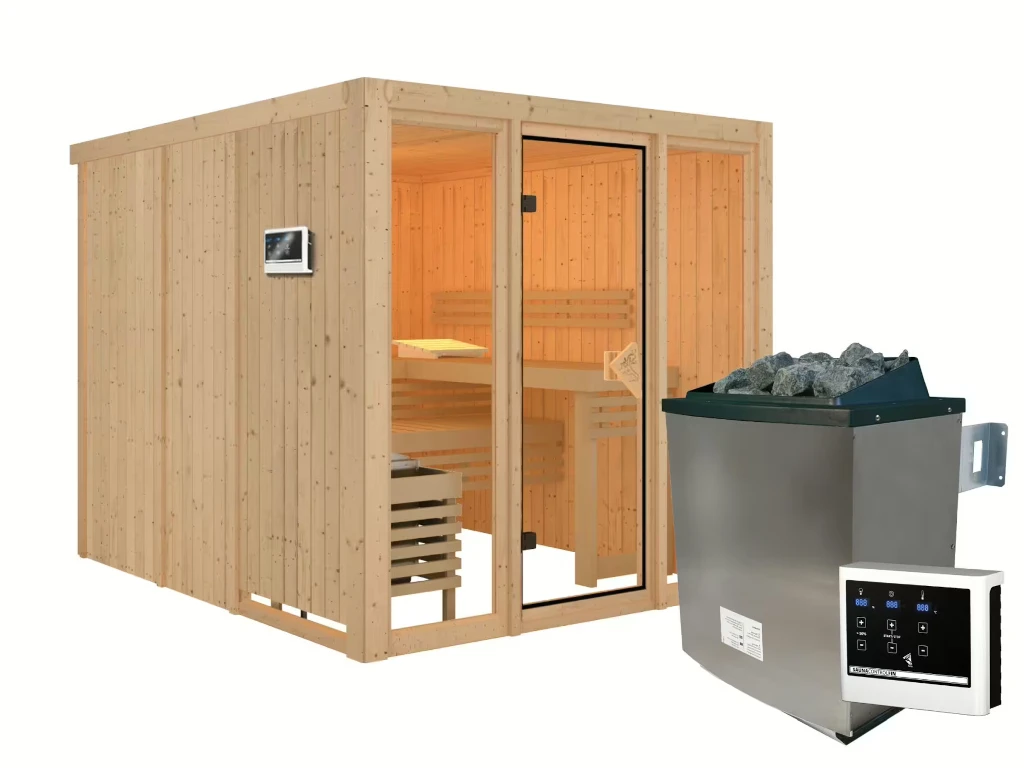 Diese Innensauna wird mit Saunaofen und einer externen Steuerung geliefert. Die Anbringung des Steuergerätes erfolgt an der Außenseite der Sauna. Ganz komfortabel kann somit die Saunasteuerung von außen erledigt und die Temperatur exakt bestimmt werden. Zusätzlich verfügt das Steuergerät über eine Anschlussstelle, über die ein weiteres elektrisches Gerät bedient werden kann.