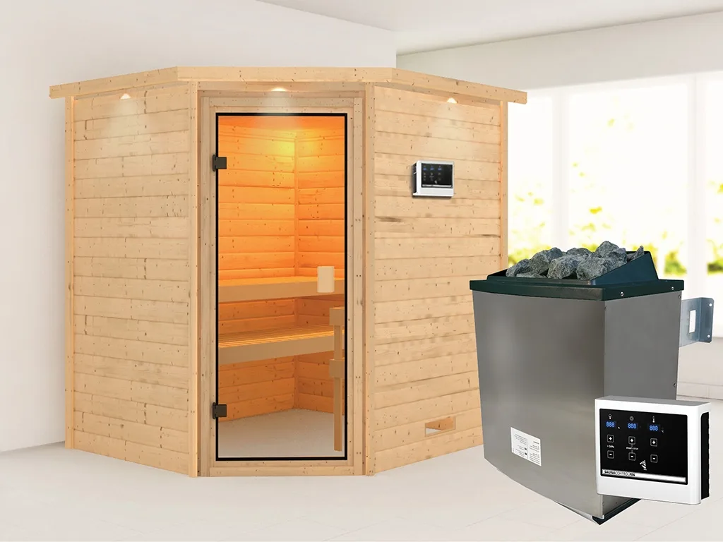 KARIBU WOODFEELING Sauna "Elea" mit bronzierter Glastür und Dachkranz + 9 kW Saunaofen externe Steuerung