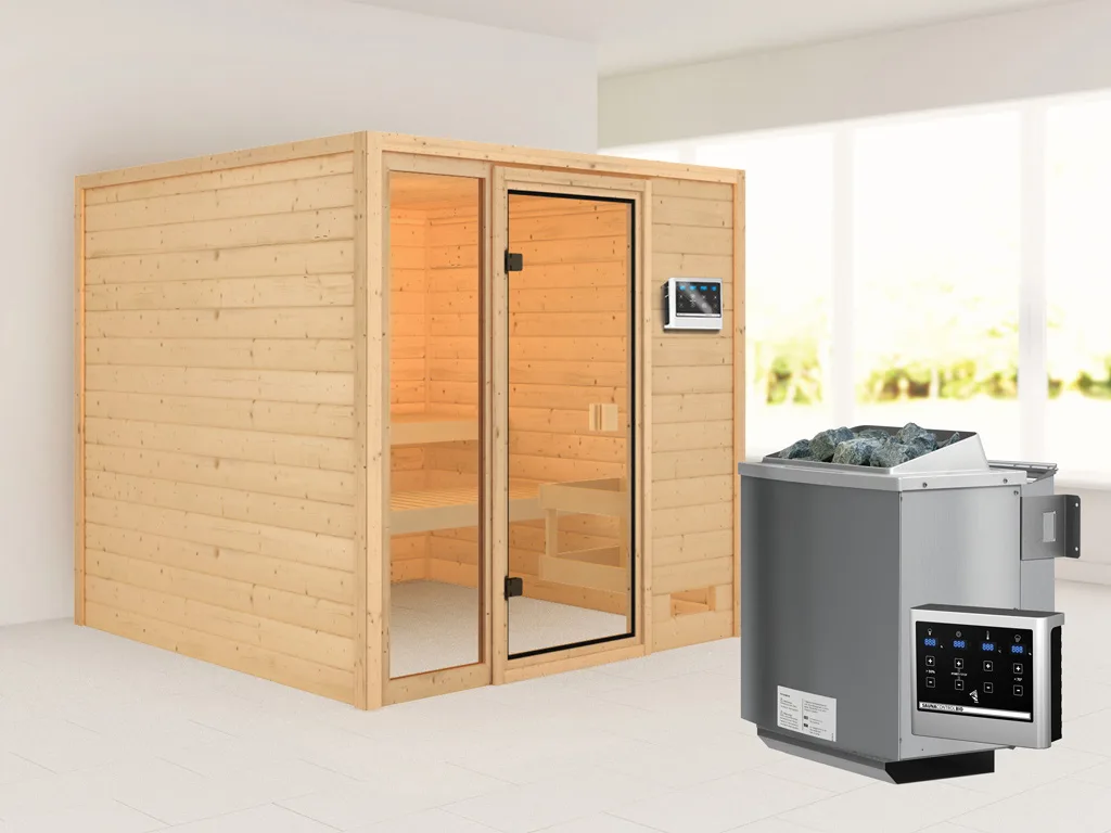Bei dieser Innensauna ist ein Saunaofen mit einer externen Steuerung inklusive. Das Steuergerät wird außerhalb der Sauna angebracht. Auf diese Weise fängt schon vor dem Saunieren der Komfort an – mit einer bequemen Bedienung von außen und einer noch exakteren Temperatureinstellung. Weitere elektrische Geräte, wie die Kabinenbeleuchtung, können ebenso an die externe Steuerung angeschlossen und bedient werden.