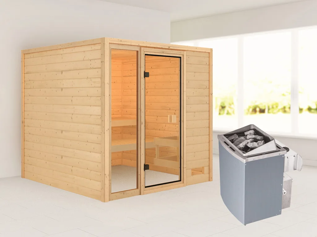 2 Liegen, 9 kW Saunaofen, int. Steuerung, Ofenschutzgitter, Montageanleitung.