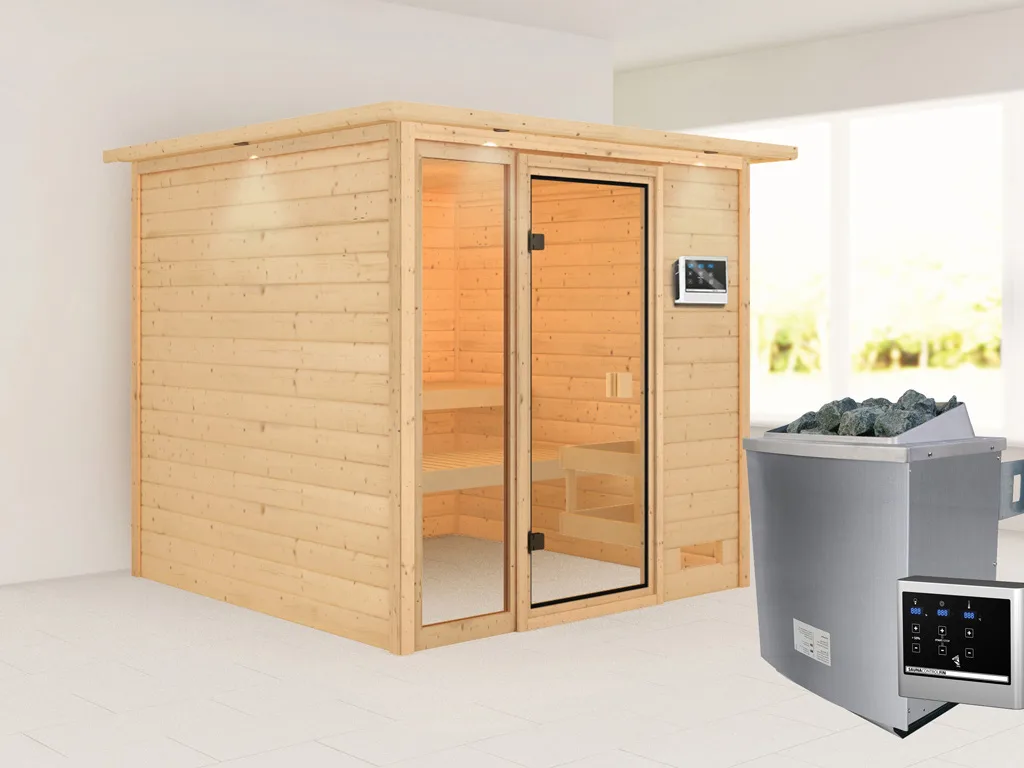 Diese Innensauna wird mit Saunaofen und einer externen Steuerung geliefert. Die Anbringung des Steuergerätes erfolgt an der Außenseite der Sauna. Ganz komfortabel kann somit die Saunasteuerung von außen erledigt und die Temperatur exakt bestimmt werden. Zusätzlich verfügt das Steuergerät über eine Anschlussstelle, über die ein weiteres elektrisches Gerät bedient werden kann.