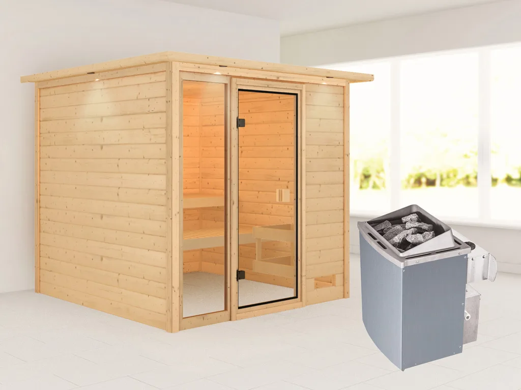 2 Liegen, 9 kW Saunaofen, int. Steuerung, Ofenschutzgitter, Montageanleitung.