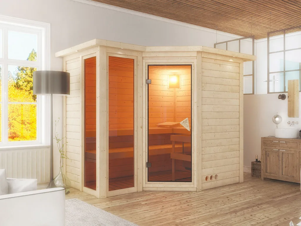 Bei der Montage einer Sauna muss ein Mindestabstand von 10 cm zu Wänden und Decke unbedingt eingehalten werden, um gute Luftzirkulation zu gewährleisten. So kann feucht-warme Luft besser abziehen. In diesem Zusammenhang müssen die Mindestraumhöhe und -breite beachtet werden.