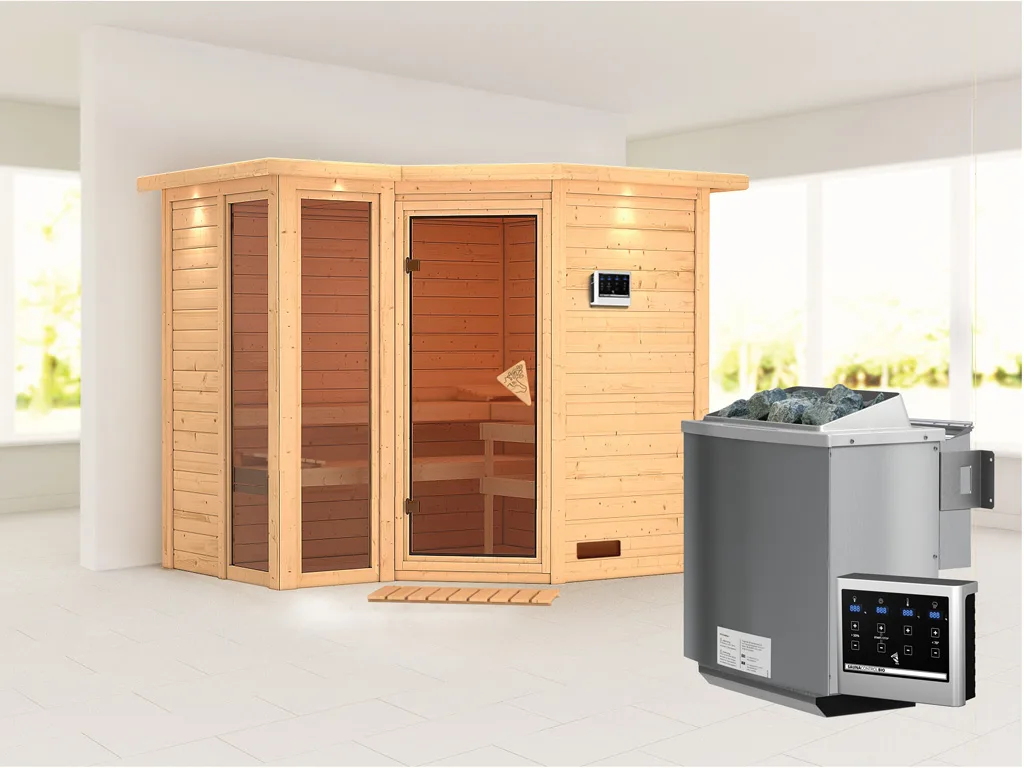 Bei dieser Innensauna ist ein Saunaofen mit einer externen Steuerung inklusive. Das Steuergerät wird außerhalb der Sauna angebracht. Auf diese Weise fängt schon vor dem Saunieren der Komfort an – mit einer bequemen Bedienung von außen und einer noch exakteren Temperatureinstellung. Weitere elektrische Geräte, wie die Kabinenbeleuchtung, können ebenso an die externe Steuerung angeschlossen und bedient werden.