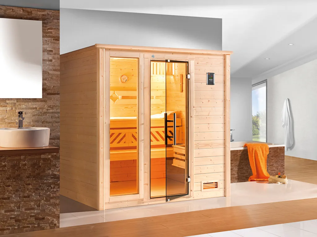 Unsere Wellnessartikel (Saunen, Saunahäuser, Saunafässer, Kotas, Infrarotkabinen, Saunaöfen etc.) dürfen nur für den privathäuslichen Gebrauch verwendet werden! Saunaöfen und dazugehörige Steuerelemente dürfen nur durch einen örtlich zugelassenen Elektroinstallateur mittels festem Anschluss an das Netz angeschlossen werden. Ausnahme: 230 Volt Plug-&-Play-Saunaöfen. Die Mindestsicherheitsabstände vom Ofen zur Wand und vom Ofen zum Ofenschutz müssen unbedingt eingehalten werden. Bei 9-kW-Öfen muss die Höhe des Ofenschutzes angepasst werden. Bitte beachte zu den obig genannten Hinweisen die beigefügten Montageanleitungen.