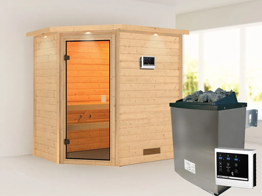 Sauna Massivholzsauna Jella mit Dachkranz, inkl. 9 kW Ofen mit externer Steuerung