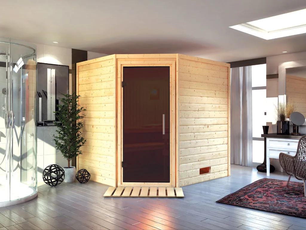 Bei der Montage einer Sauna muss ein Mindestabstand von 10 cm zu Wänden und Decke unbedingt eingehalten werden, um gute Luftzirkulation zu gewährleisten. So kann feucht-warme Luft besser abziehen. In diesem Zusammenhang müssen die Mindestraumhöhe und -breite beachtet werden.