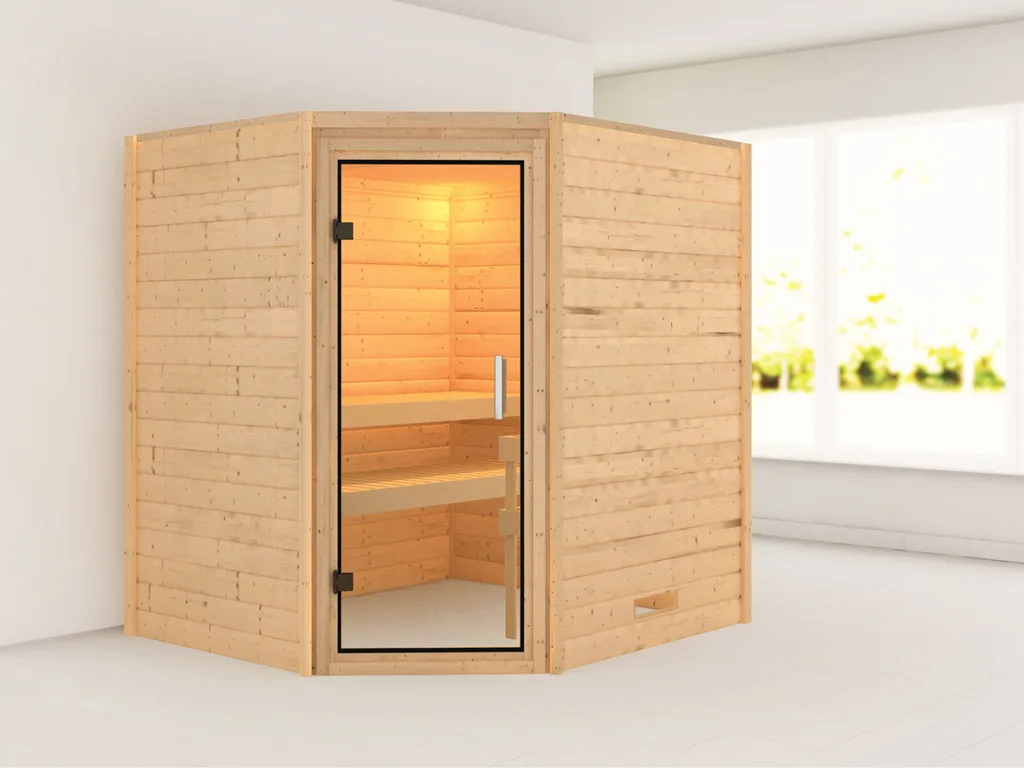 Bei der Montage einer Sauna muss ein Mindestabstand von 10 cm zu Wänden und Decke unbedingt eingehalten werden, um gute Luftzirkulation zu gewährleisten. So kann feucht-warme Luft besser abziehen. In diesem Zusammenhang müssen die Mindestraumhöhe und -breite beachtet werden.