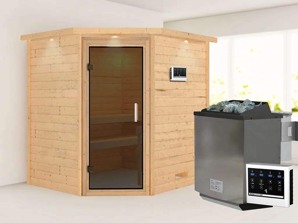 Sauna Massivholzsauna Mia mit Dachkranz, inkl. 9 kW Bio-Ofen mit externer Steuerung