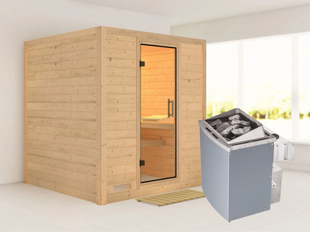 Sauna Massivholzsauna Mojave Klarglas Ganzglastür + 9 kW Saunaofen mit Steuerung