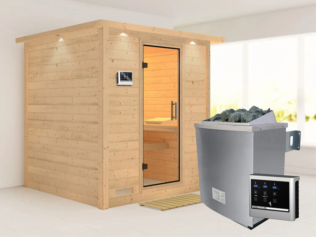 Bei dieser Innensauna ist ein Saunaofen mit einer externen Steuerung inklusive. Das Steuergerät wird außerhalb der Sauna angebracht. Auf diese Weise fängt schon vor dem Saunieren der Komfort an – mit einer bequemen Bedienung von außen und einer noch exakteren Temperatureinstellung. Weitere elektrische Geräte, wie die Kabinenbeleuchtung, können ebenso an die externe Steuerung angeschlossen und bedient werden.